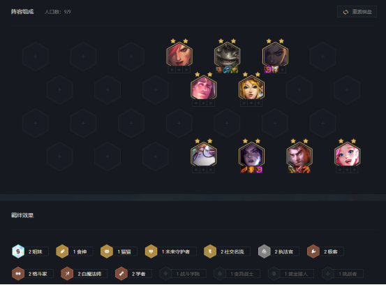 这套九五保留了几个关键羁绊:2姐妹、2执法官、2白魔法师,基本都是给5费卡保留一个羁绊。从8人口初级阵容,过渡到上图的九五至尊中,主C船长的装备转交给杰斯,副C奎因的装备给卡莎,再养一个副C金克丝(出AP)或是维克托。