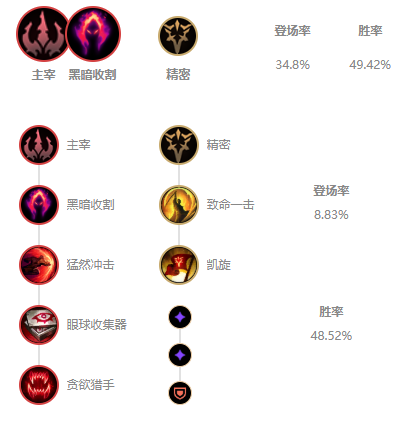 中单凯隐符文选择爆发性最强的电刑,猛然冲击可以凯隐的穿甲能力,眼球收集器增加伤害,无情猎手增加攻速,副系精密选择气定神闲和致命一击来增加回复和击杀能力。