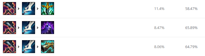 当前凯隐的神话装备流行出渴血战斧,强大的回血能力可以让凯隐进场后有足够的保命能力。魔宗能够为凯隐提供不错的蓝量,增加他的技能急速和伤害。后续的装备以穿甲为主,巨蛇、夜刃、收集者都十分好用。