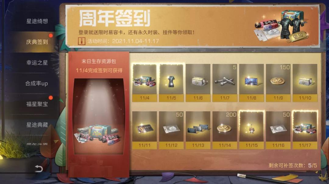 2.在11月4日——11月17日期间,周年签到限时开启。