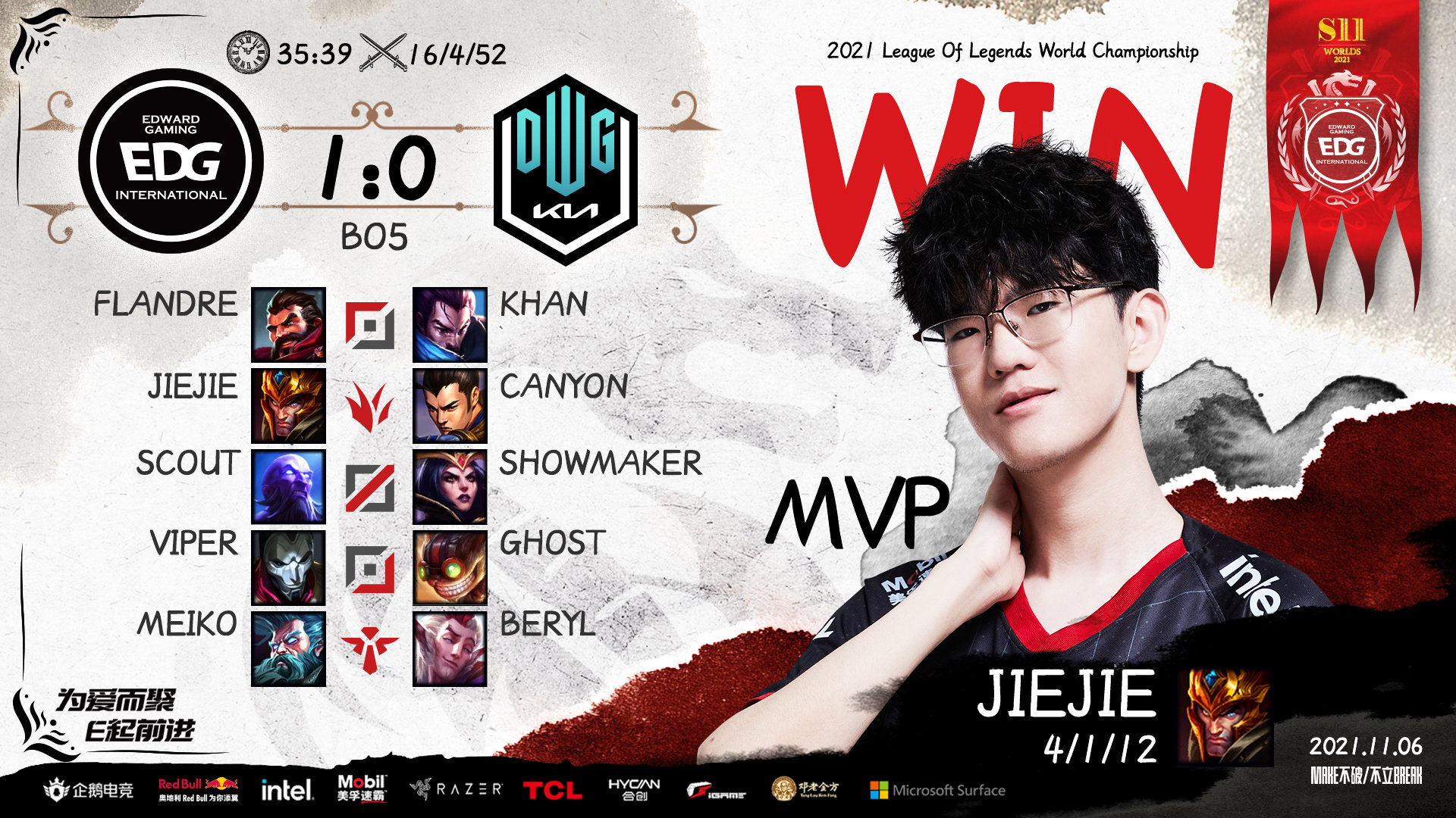 第15分钟,第二条峡谷先锋团,EDG打野Jiejie皇子闪现接大率先击杀洛,随后EDG.Meiko成功复活Jiejie完成一波0换3。