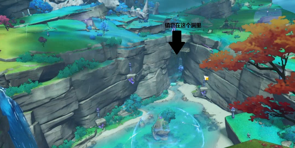 第一件镇物在我们之前去过的蛇神之首的解谜点,进入这个洞内,需要拿到一个雷种子,然后顺着标记朝上方飞,再拿一个雷种子穿过屏障就可以拿到镇物了。