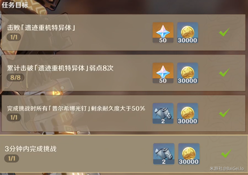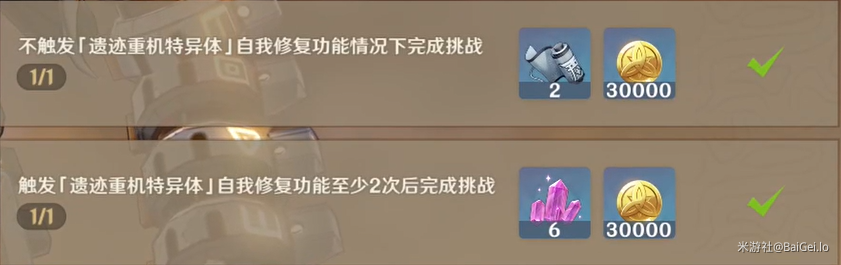 2.遗迹重机攻击力,防御力取决于开启的【普尔希娜光钉】数量,遗迹重机空血能复活,光钉充能完成挑战结束。