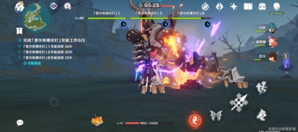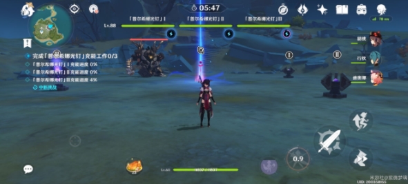 在它站起来之前,我们先用雷系角色点亮三个光钉,这里我用的北斗,不过我感觉雷弓更方便,可惜我练度不高,会暴死。