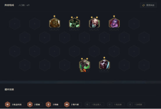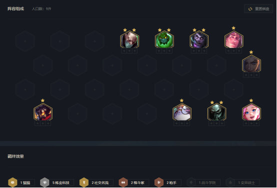 根据海克斯羁绊加持不同,变阵思路也有所不同。如果是增加炼金羁绊,要做5炼金/4格斗;要么做7炼金、上9级养维克托;还有一种是5炼金+2名流,如上图所示。