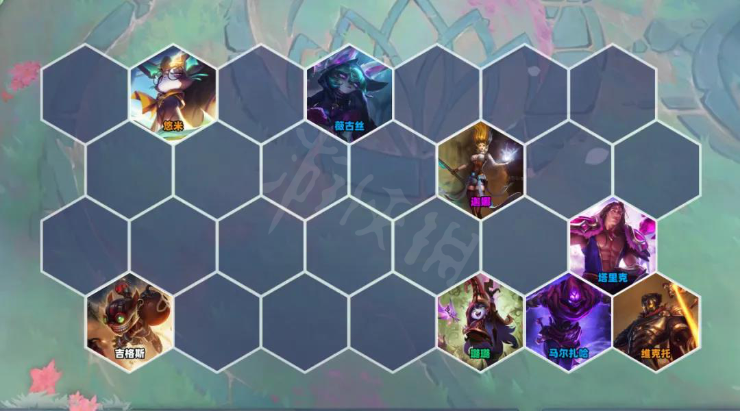 薇古丝单顶前排承伤,其余人视情况分散防AOE或者抱团防刺客,阵容自带1名流,但名流对这个阵容来说不关键,刷在最后一排能吃最好,刷前排就让薇古丝或者猫咪吃。
