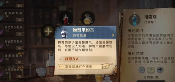 2.它的配方需要使用狮鹫爪粉末、蜥蜴血等来合成,而狮鹫就只能够通过高星禁林红色线索来探索获得