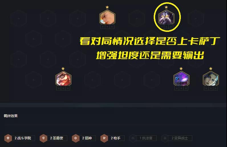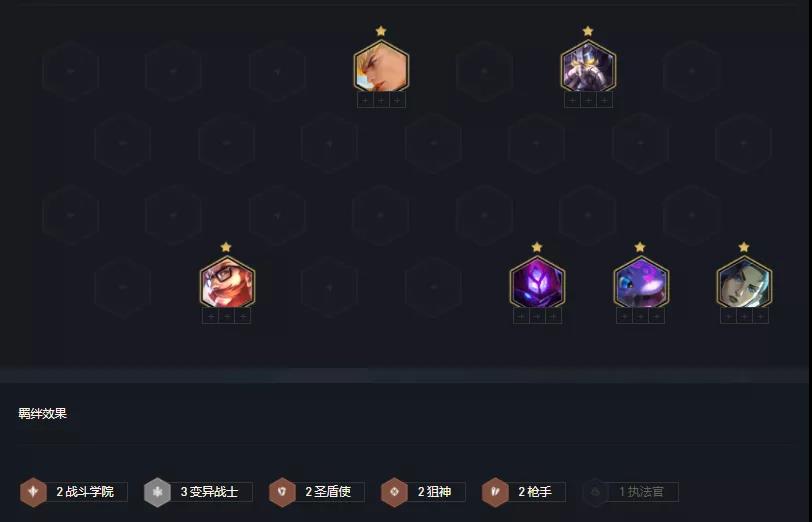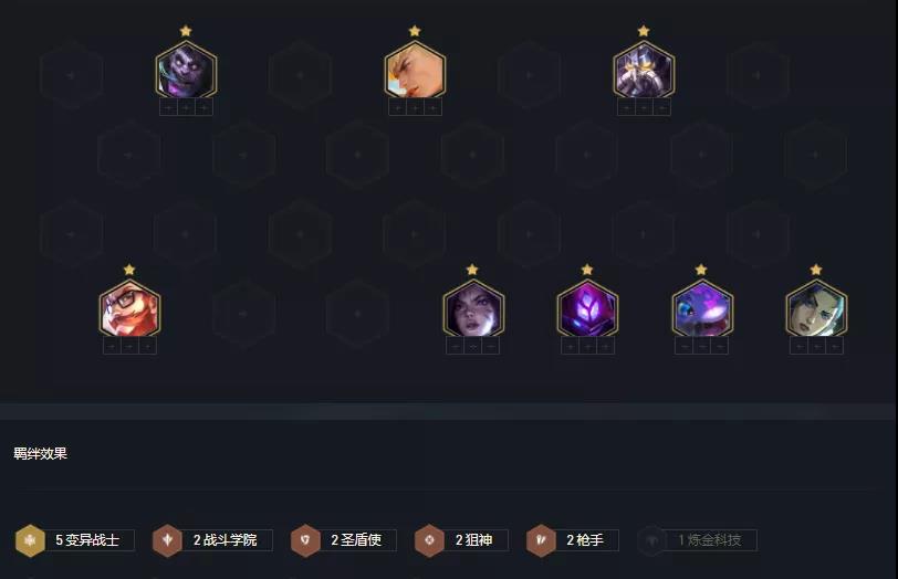 羁绊组成:2学院 3/5变异 2圣盾 2狙神 2枪手