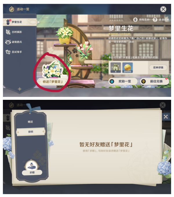 可以查看到左下角有收送梦里花选项