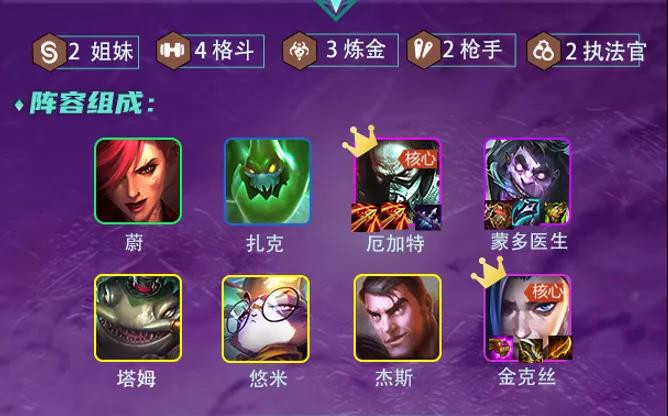 5阶段后:5-1升级8人口,大搜卡,重点找到蒙多2星与厄加特2星,搜到金克斯就换下普朗克,如果搜到塔姆看自己经济与场上质量,如果较高就开始喂养主要喂养血量与法强。