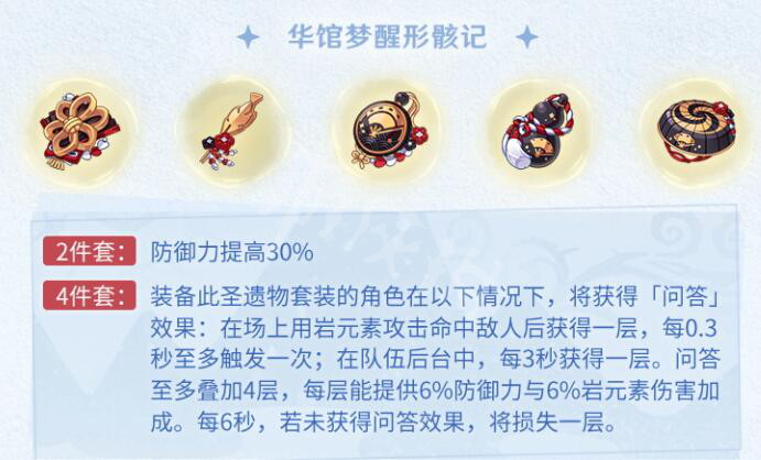 4件套:装备此圣遗物套装的角色在以下情况下,将获得「问答」效果:在场上用岩元素攻击命中敌人后获得一层,每0.3秒至多触发一次;在队伍后台中,每3秒获得一层。
