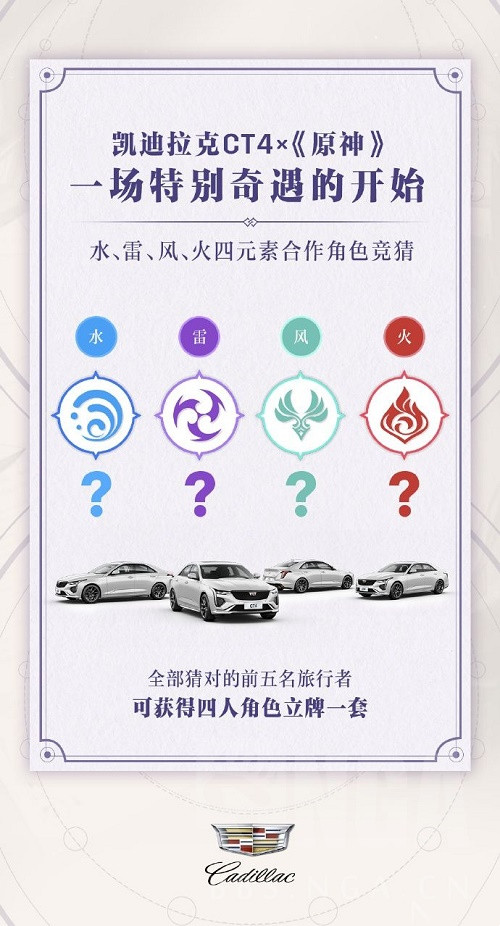 2.分别持有水、雷、风、火神之眼的四位神秘角色将与凯迪拉克CT4一起带你奔赴属于你的冒险之旅。