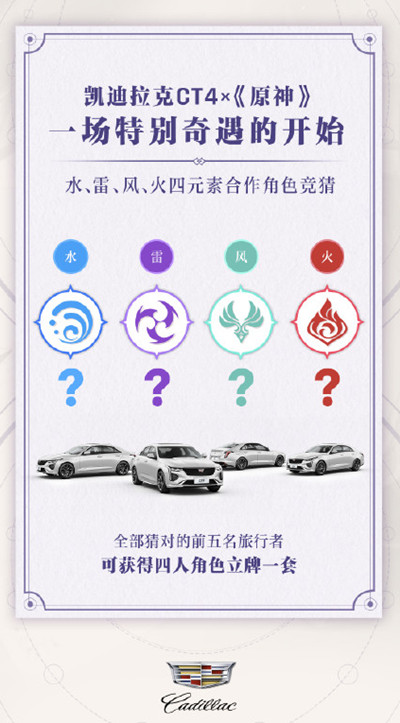 分别持有水、雷、风、火神之眼的四位神秘角色将与凯迪拉克CT4一起带你奔赴属于你的冒险之旅。