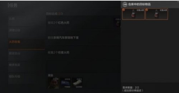 一是多跑几次农场地图,去地下室多摸摸,摸到够两个火药之后,点击任务进入任务界面,选择提交会弹出一个页面,选择红色火药,点击提交按钮,提交后就完成这个目标了。