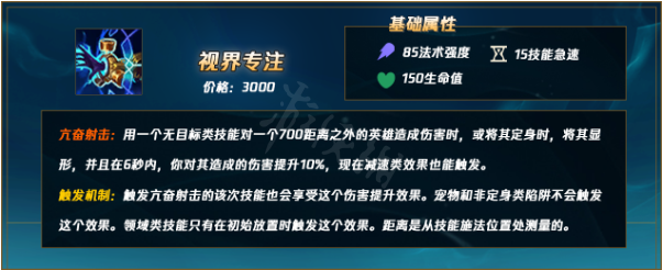 现在视界专注可以通过减速触发,蘑菇有减速效果,也就是说战斗中贴脸扔的蘑菇也能触发视界专注获得10%的伤害加成。团战中埋蛋流提莫的核心伤害来源不是普攻,而是Q和蘑菇。该装备可以有相当不错的伤害收益。