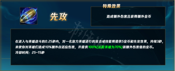 1.先攻不仅可以偷钱,还拥有易伤效果。提莫在面对上路战士的时候拥有射程优势,大部分情况是可以先手打到对方的。在节奏期和团战中,也能利用草丛隐身或者原地隐身去打一个先手环境。10%的易伤比强攻前期的8%高,但少了直接伤害。三秒内带来的经济收入还是比较可观的。