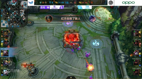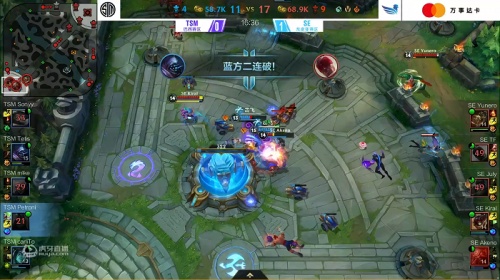 SE对阵TSM首场比赛。1分50秒,TSM奥拉夫想要配合队友进行越塔SE鳄鱼,怎料配合失误自己连续抗塔,白白送出人头将前期节奏带崩。7分22秒,TSM三人越塔上路SE皎月,但被SE三人将TSM下路二塔拆除,导致TSM这波节奏并不占优。9分18秒,双方在小龙处爆发团战,SE完美配合打出零换四,这一波节奏直接让SE将经济领先近1W。最终,SE轻松拆掉水晶,拿下胜利!
