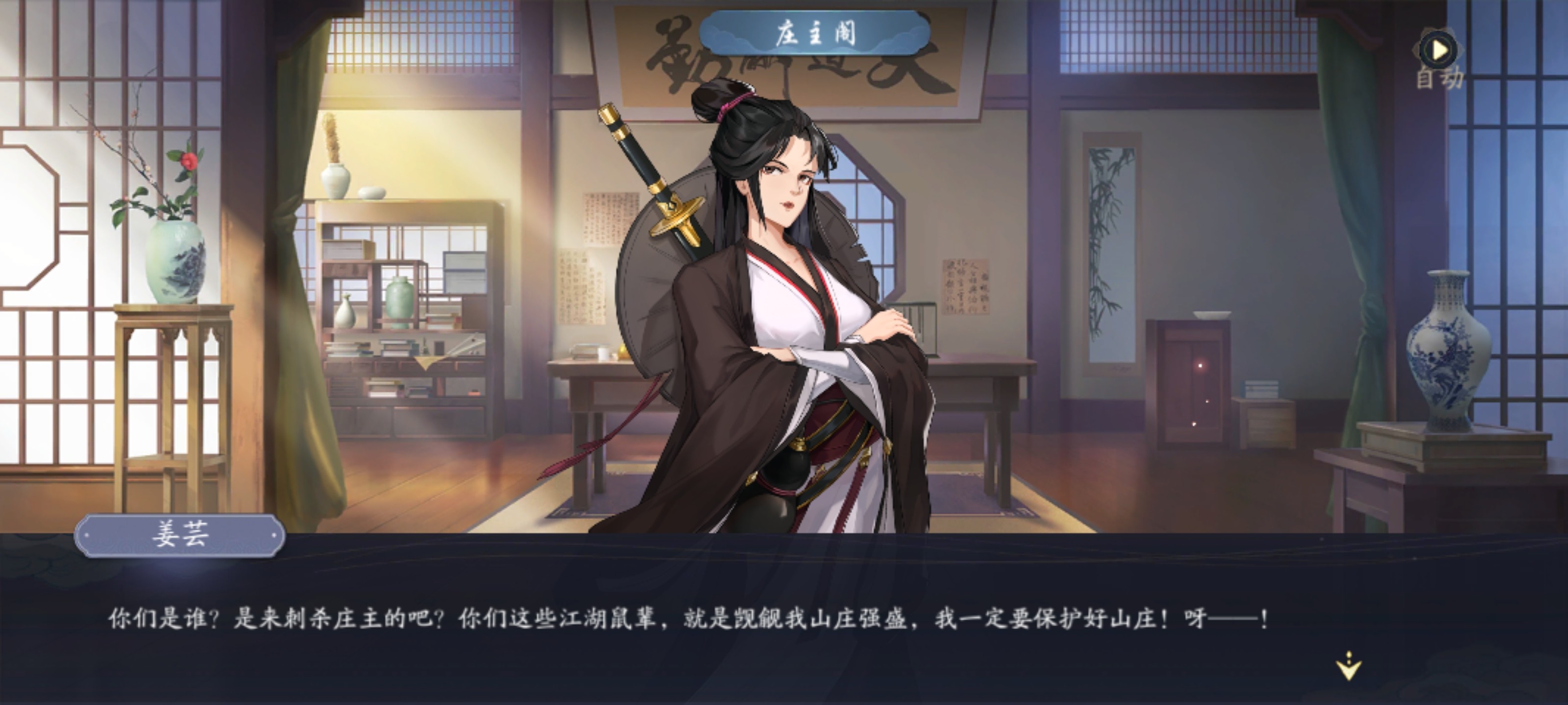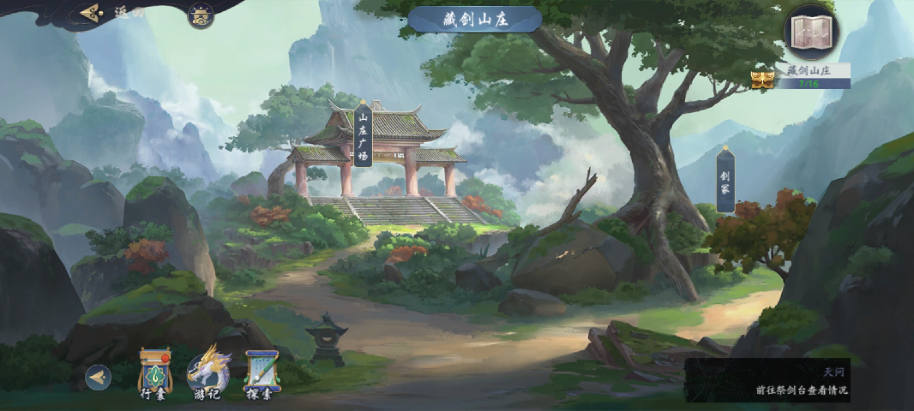 1、与藏剑弟子对话开启,进入山庄广场找藏剑长老对话开启庄主阁,山庄正殿等场景