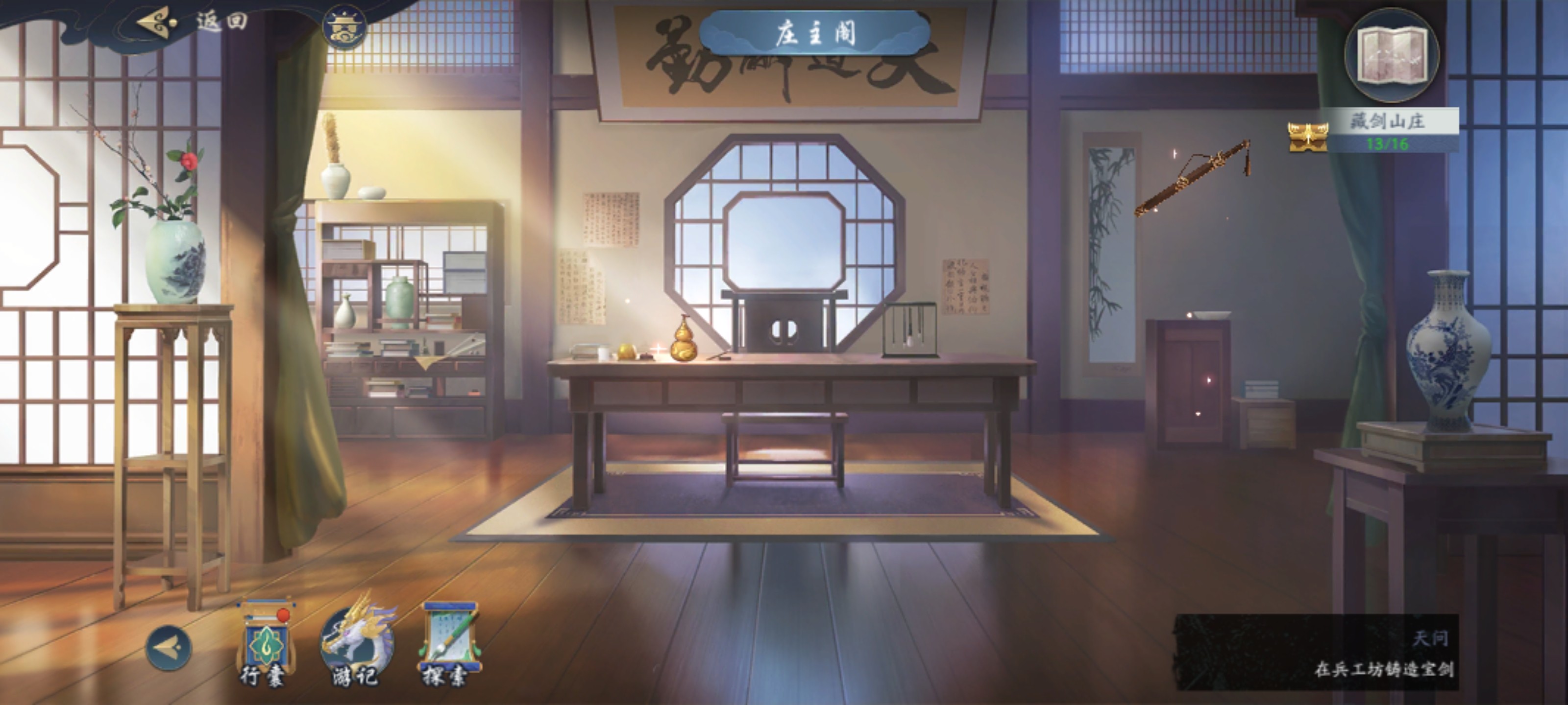 6、姜凡前往兵工坊铸剑,风来堂内有剑胚,弟子舍院有月影沙,剑庐有冷泉水,书阁有青白玉,山庄正殿有金块,庄主阁有一把赤金剑,需要先熔炼成赤金块。铸成一把宝剑去和天问剑共鸣