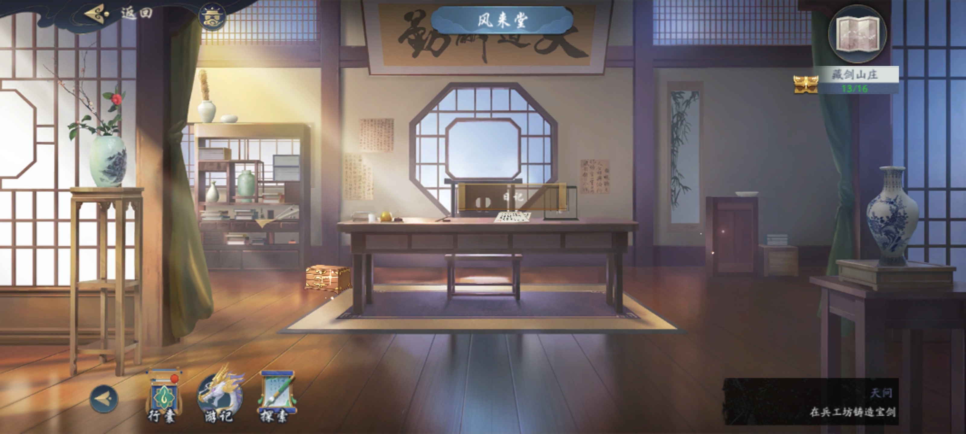 10、风来堂桌上日记获取奖励,剑冢左下角领取铁块,庄主阁桌上葫芦获取奖励,风来堂桌子左边获取箱子
