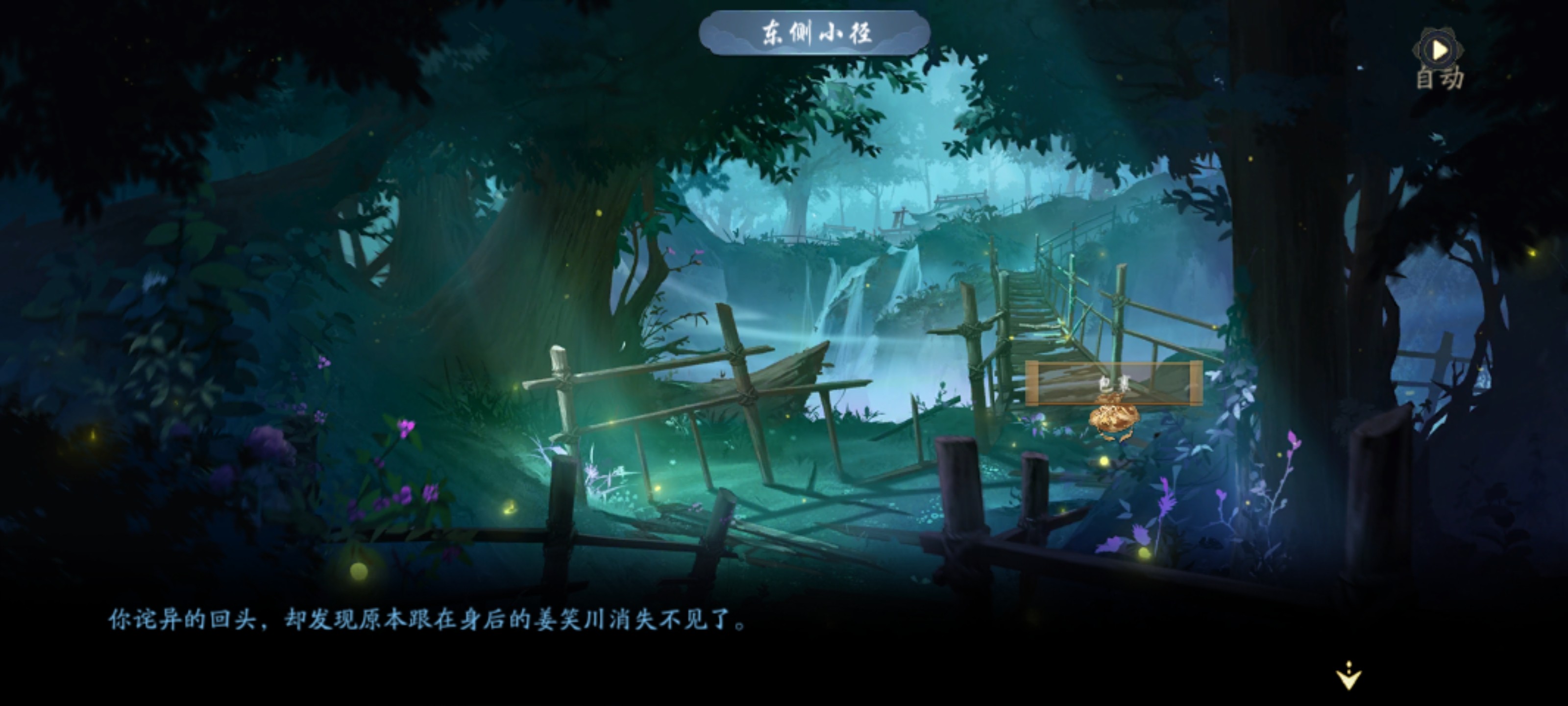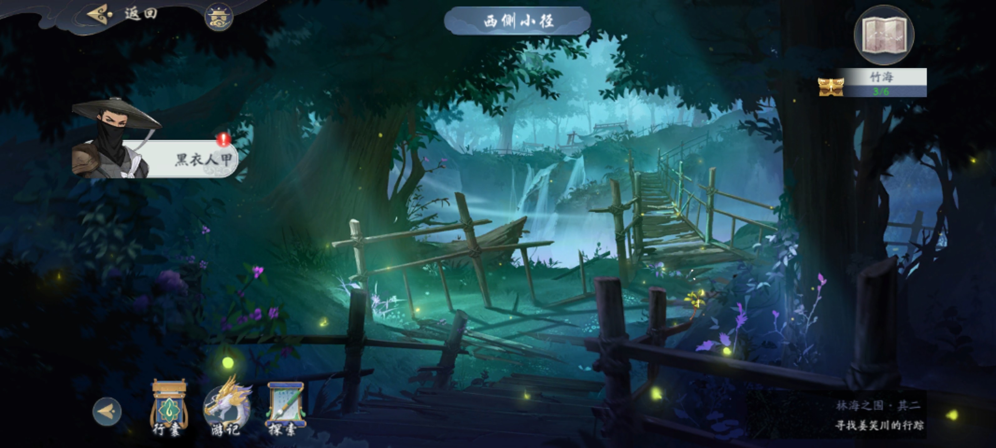 1、竹海篇,与姜笑川对话开启。姜笑川包裹被猴子夺走,为追上猴子进入东侧小径