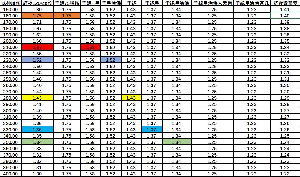 同时上千缘使用星的情况下,式神爆伤小于280,大公主120%爆伤的提升开始领先千姬,爆伤越低,大公主提升越高