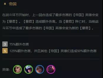 暴君的额外伤害加成让帝国赛恩的伤害有极致的提升,帝国羁绊也是新版本中最强的单核输出加成羁绊,如果能有帝国加成的海克斯羁绊凑齐5帝国的羁绊加成,125%的额外伤害加上为其他帝国英雄造成50%额外伤害,帝国完全能够和战斗学院的输出加成相媲美,而帝国巨像赛恩就是依靠超高的额外伤害加成加上法爆无尽让技能伤害拉到最满,并且赛恩的技能范围很大,很轻松的就可以威胁到敌方的后排棋子,如果能够再补上一个刺转纹章,赛恩就有更强的针对性,针对敌方后排站位,直接一发入魂秒杀后排,让敌人逃无可逃。