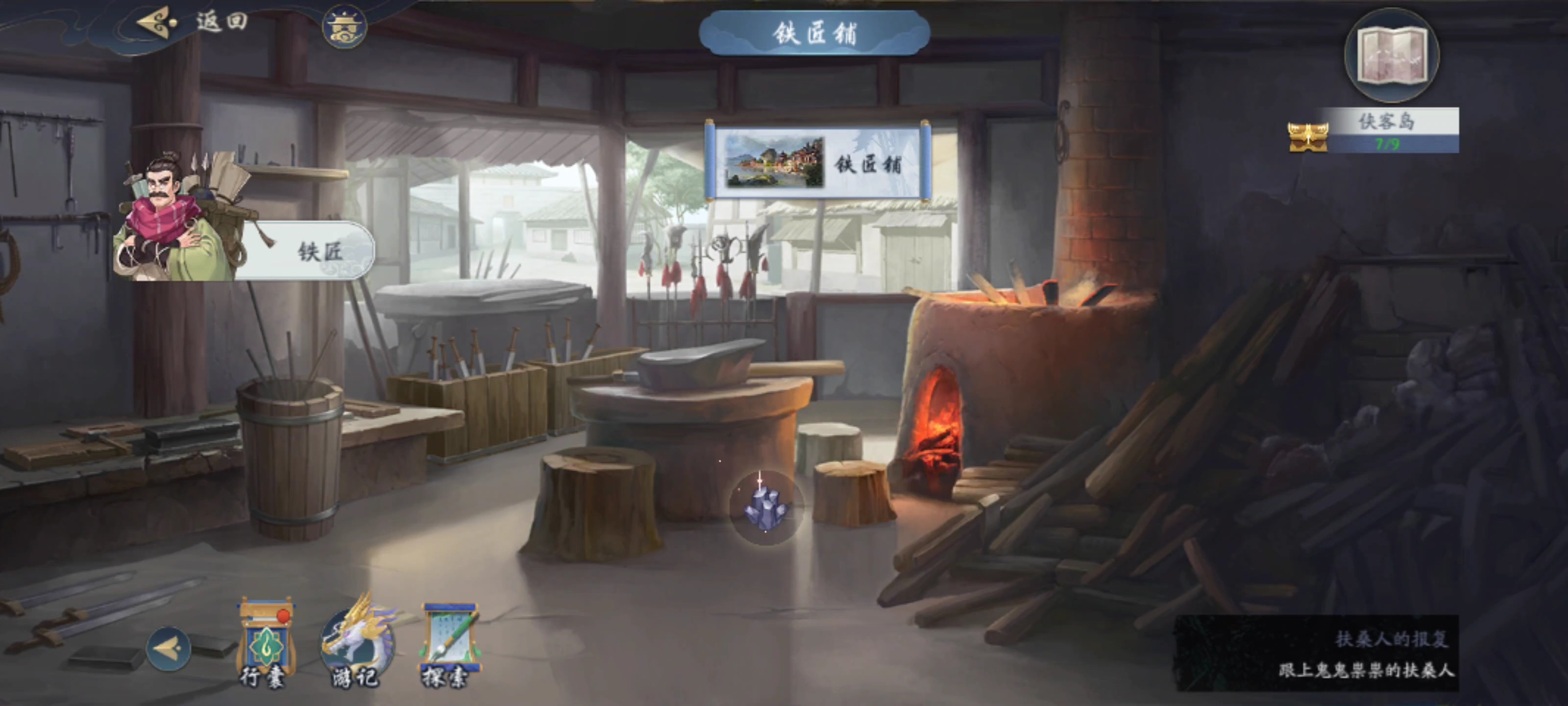 2、进入天字房和杨素素对话,点击床睡一觉,听到扶桑人对话,开启铁匠铺神犀洞等场景