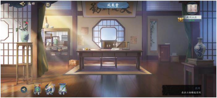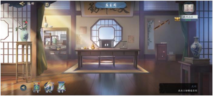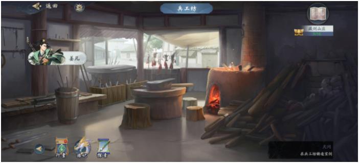 6、姜凡前往兵工坊铸剑,风来堂内有剑胚,弟子舍院有月影沙,剑庐有冷泉水,书阁有青白玉,山庄正殿有金块,庄主阁有一把赤金剑,需要先熔炼成赤金块。铸成一把宝剑去和天问剑共鸣