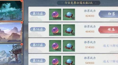 第一个就是梅花桩的挑战,这个挑战难度总体来说不是很高,玩家只要使用特定的阵容去参加就行了。梅花桩每层都有对应的战斗力要求,点击挑战就行了。梅花可以获得修炼丹。