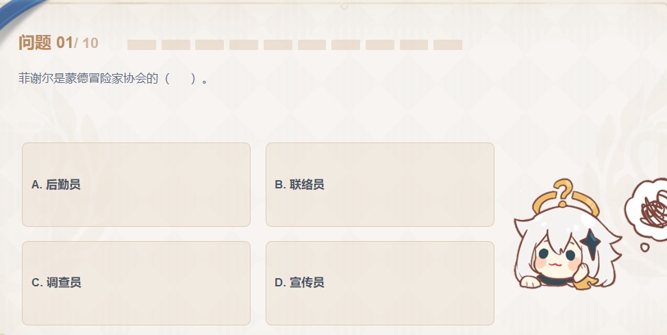 2.玩家们在游戏中如果多多注意剧情的话就会发现菲谢尔是蒙德冒险家协会的调查员,这一题也是非常的简单的,完全只是考察了玩家们对于角色背景的了解,喜欢菲谢尔的玩家们应该也知道吧