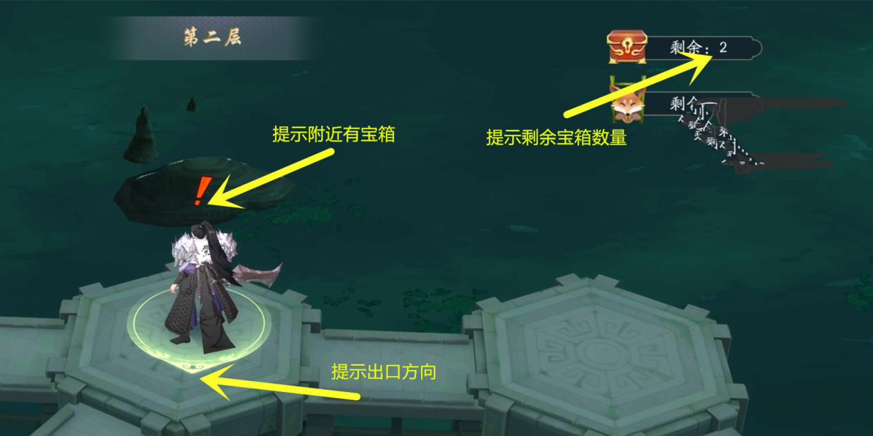 1、地图右上角的宝箱旁边的数字,表示的是当前地图还有未开的宝箱数,不显示0时,要多转转地图。当附近有宝箱时,角色头上会有个叹号的提示,要留意提示。