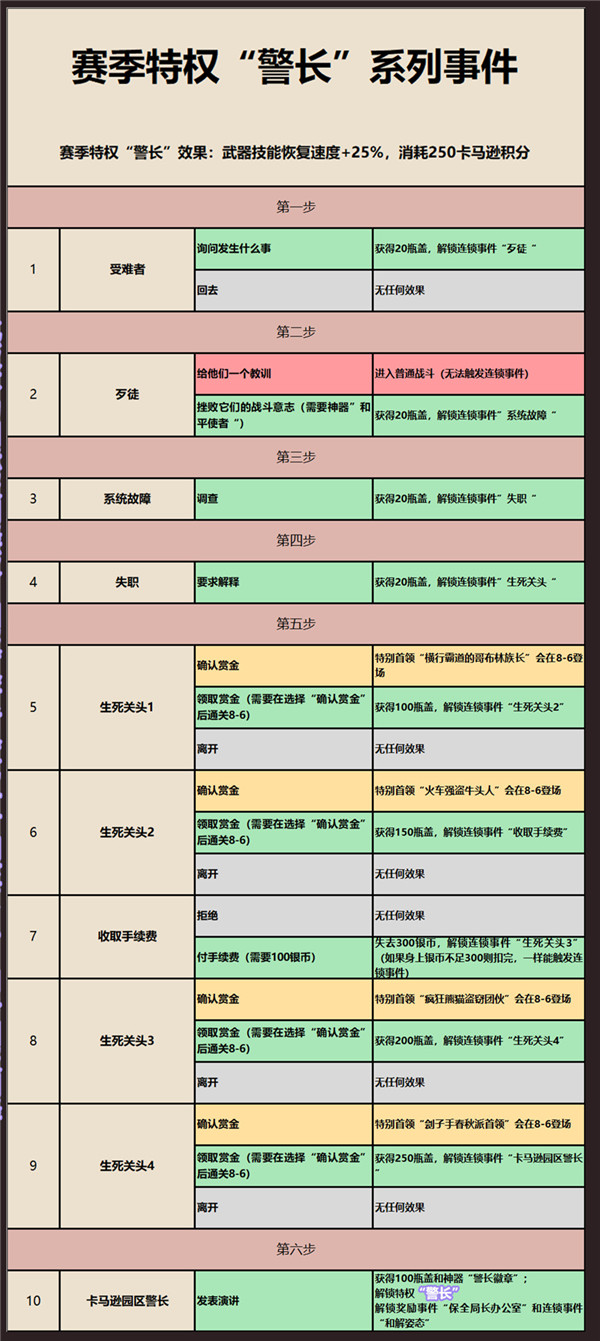3、本期赛季事件流程大概需要2-3小时(不包括难5、难6的挑战事件),第一回合推荐至少先做到解锁警长特权这一步。