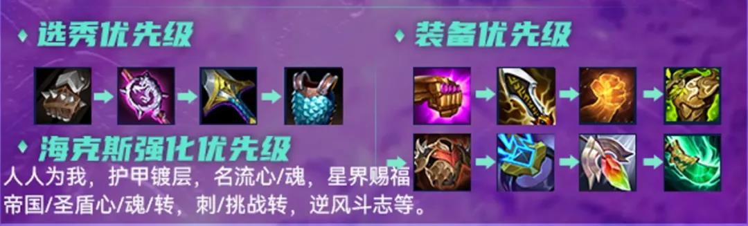 这套阵容算是比较吃海克斯强化的,特别是羁绊类强化,名流心/魂、人人为我、帝国/圣盾心/魂/转,刺/挑战转最优,人人为我、护甲镀层、星界赐福、逆风斗志等也均可选择。