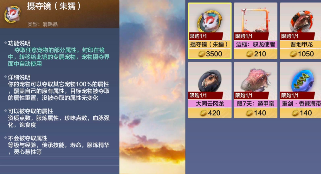 2、使用方式:在宠物摄夺界面使用。注意摄夺镜是指定道具,需要作用在专属宠物身上的,朱獳现在还没有出来的,所以无法使用