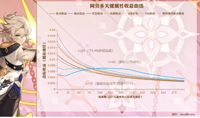 ①阿贝多的防御阈值在170%左右,在此之后等量双暴收益更高。