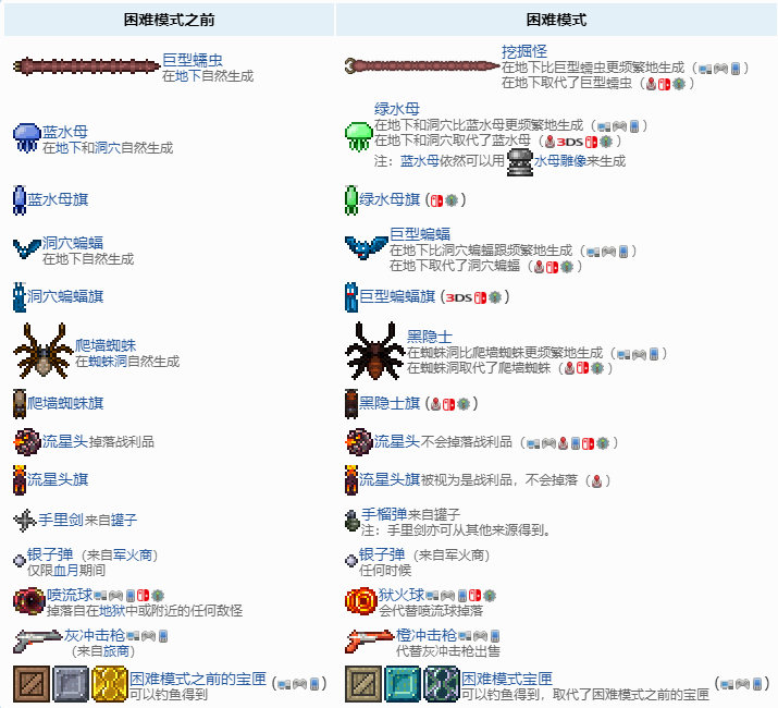 顾名思义,困难模式实质上是初始世界的一个更困难的版本。世界在玩家打败了血肉墙 Boss 后永久性地转变为困难模式。困难模式为玩家提供新的挑战,并为他们提供多得多的内容供其探索。