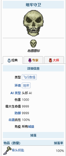 在骷髅王被击败前,玩家也可以进入地牢,但无法完整探索它。在击败骷髅王之前在地牢中探索到-3深度时,会生成能够一击必杀大部分玩家的地牢守卫。地牢守卫几乎无敌,击杀它也不会使玩家能够进入地牢,并且击败地牢守卫能获得的唯一物品是骨头钥匙。