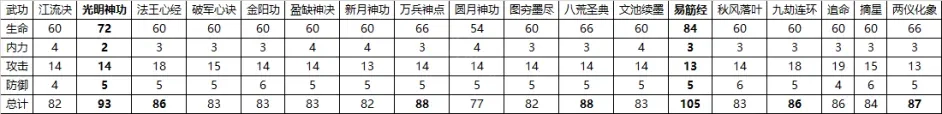数值最高易筋经,其次是光明神功,不过貌似有数值衰减,然后剩下的数值比较高的都加粗了。