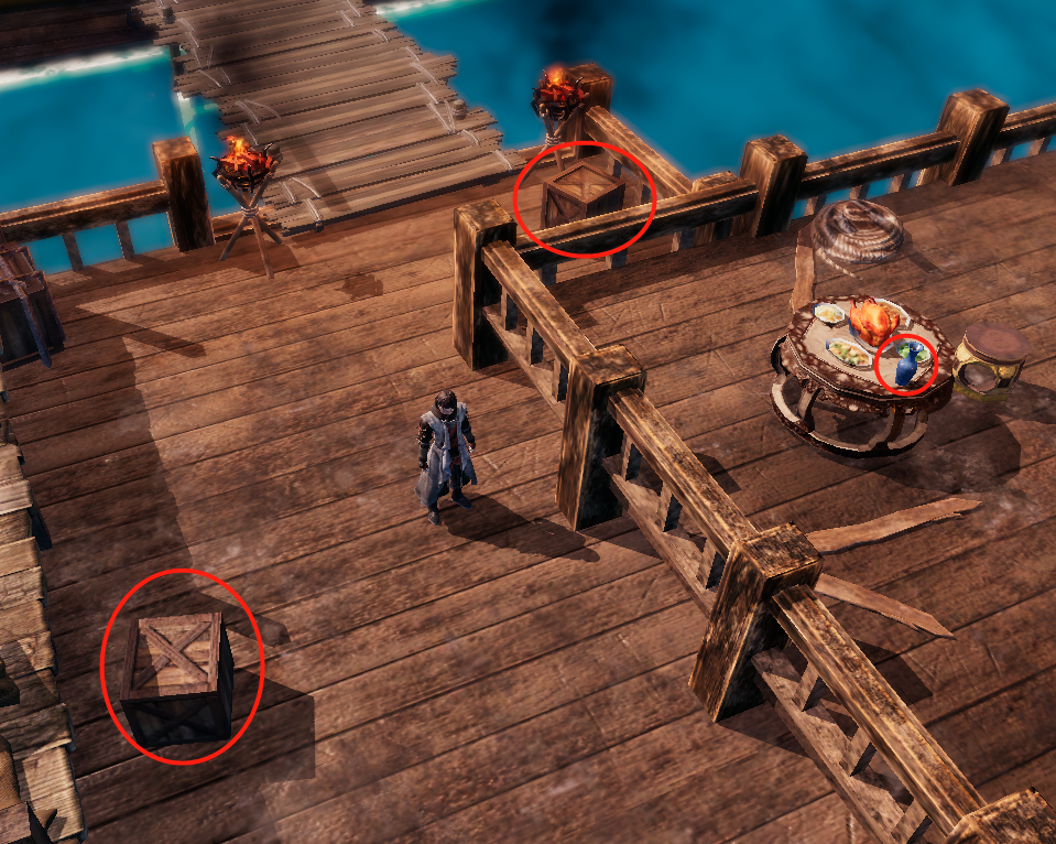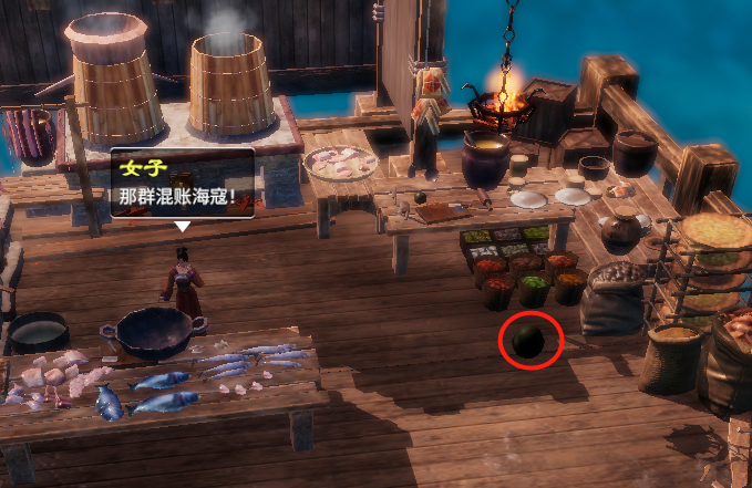 在碧月阁使用轻功来到神经质海寇这边,破坏左侧箱子,找到后方的箱子→一撮火药并点燃,对桌子上的美酒→碧月毒酒,神经质海寇死后搜身,取得钥匙,牢笼→沾满汗液的钥匙。