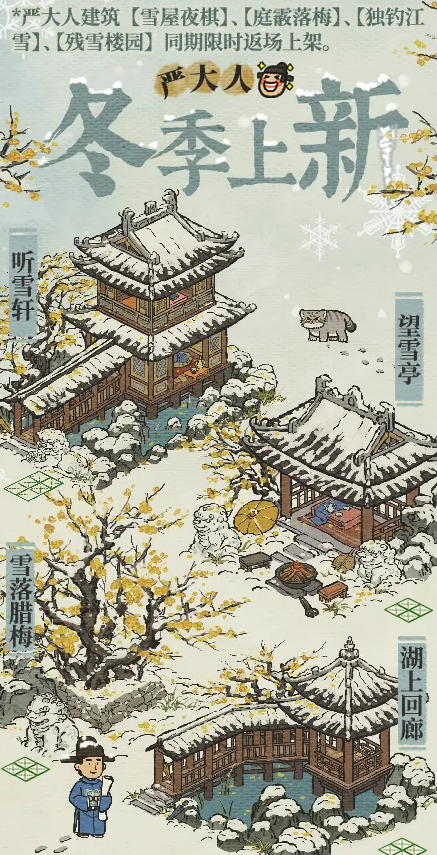 街机cn 来源:厂商 发表于:2021-12-06《江南百景图》游戏中12月6日(今天)严大人冬季建筑上新了!很多玩家还不是很清楚到底上新了什么!今天小编就为大家分享一下游戏中12月6日严大人冬季建筑上新的内容!有需要的玩家们和小编一起来了解一下吧!