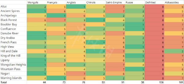 表格中的数字代表该文明在这张地图上的强度,数字越小越强势。