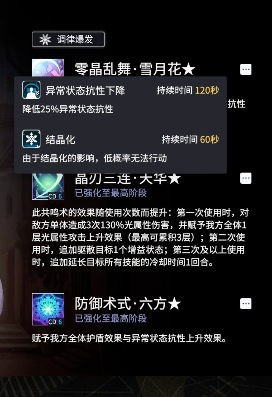 所以我塞满了异常概率增加,全程无miss,我最后叠了9层大招90的减伤,无敌!省点资源44级就行,我是直接拉满了,很肉,共鸣回血减伤也很好用。