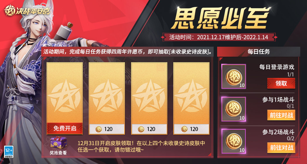开启皮肤领取。同时,该阶段仍可完成每日任务获得许愿币来抽取皮肤。