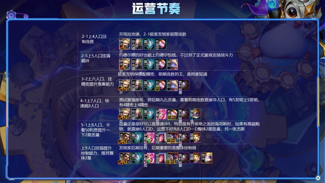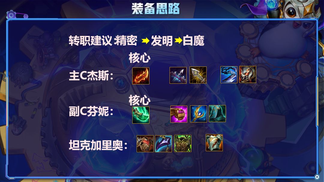 前期学习精密、发明家、极客的强势过渡方法,后面芬妮和杰斯攻速流的组合,后期加上精密羁绊的应用和猫猫的应用就能稳定的输出啦。