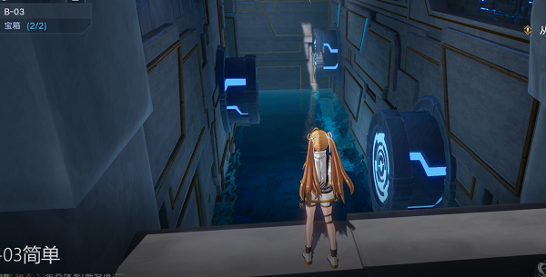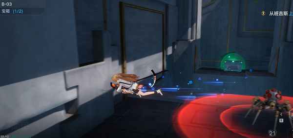 1.第一个宝箱,这里等移动平台到身边蹦上去,转到旁边开启机关,然后跳上移动平台之后开第一个宝箱即可