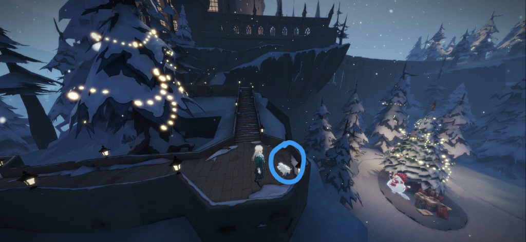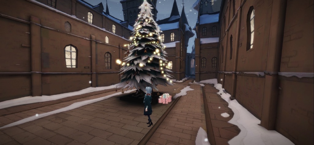 1、靠近禁林的那侧城堡庭院,大圣诞树下有粉色礼物盒。大圣诞树礼物奖励:温暖雪花*200和随机卡包