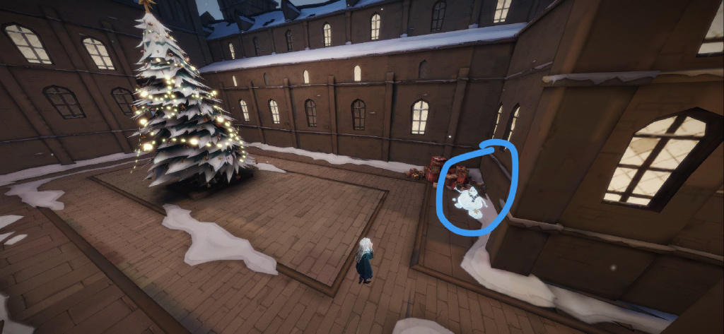 7、靠近禁林的那侧有大圣诞树的庭院角落里举着魔棒的小雪人