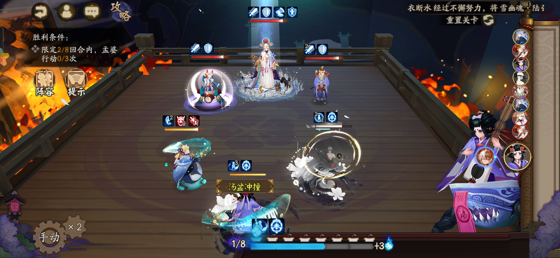 星熊控住孟婆,饿鬼吃金鱼姬,化鲸普攻鬼吞,鬼童丸在饿鬼把金鱼姬吐出来以后直接干掉小金鱼;