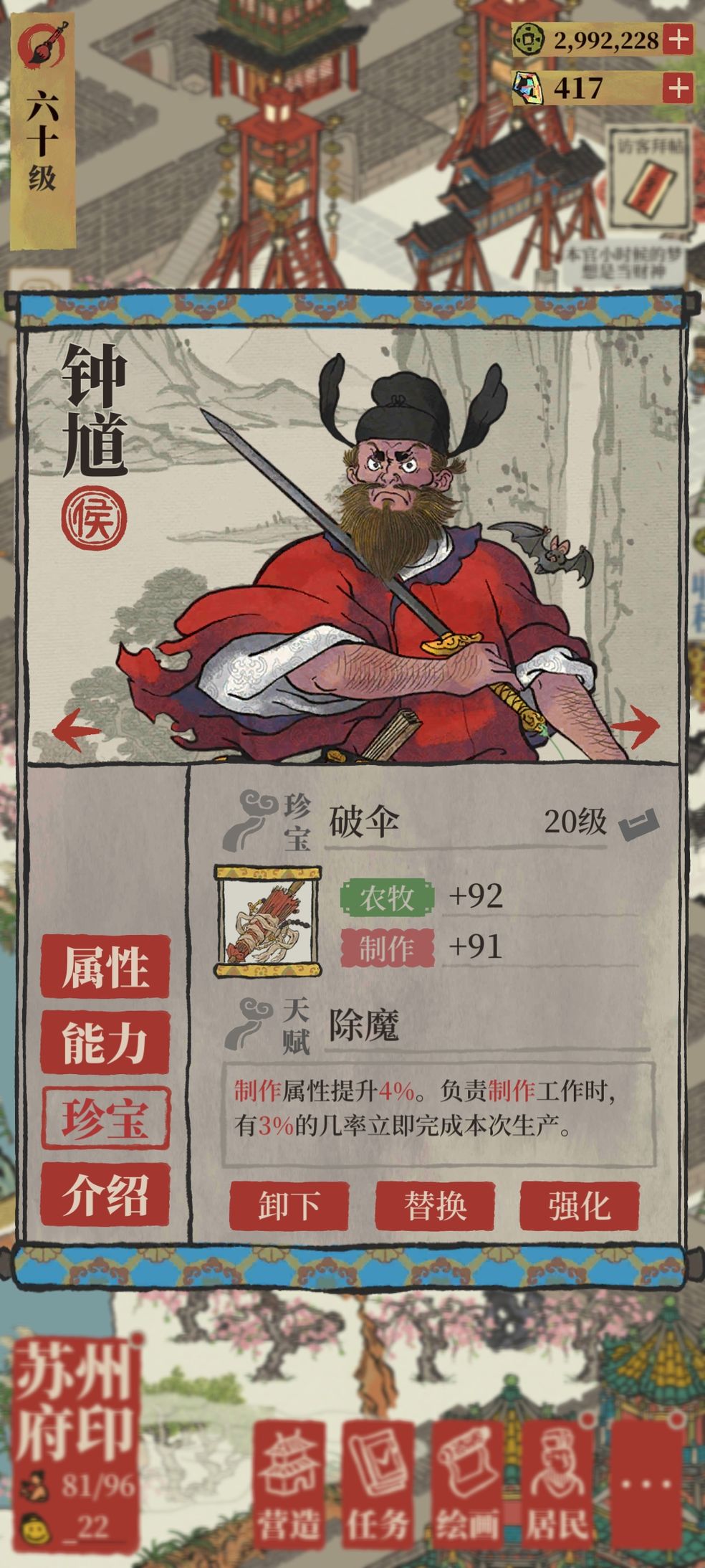 1、钟馗这个角色是一个侯级角色,擅长制作以及农牧方面,属性为优等。